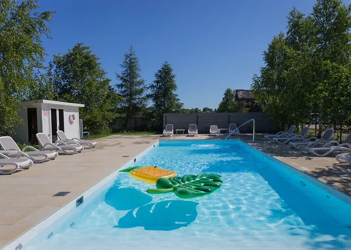 Circa 10 Gehminuten vom See Sarbsker See entfernt gelegen, bietet die Domki Leba, Apartamenty Leba - Polanki23 - Basen, Sauna, Kino einen saisonal betriebenen Außenpool. Łeba ist unter anderem innerhalb von ca. 10 Fahrminuten zu erreichen. Die Villa in Leba verfügt über Parkplätze und eine Sonnenterrasse mit Aussicht auf den Garten.